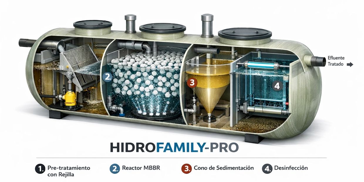 En HIDROPUR, presentamos nuestra línea HIDROFamily, diseñada específicamente para satisfacer las necesidades de tratamiento de agua residual en sectores que requieren eficiencia en espacios compactos1. Con capacidades que varían desde 2 hasta 100 metros cúbicos ($m^3$) diarios, ofrecemos una solución robusta que garantiza un impacto ambiental positivo y el cumplimiento de las normativas vigentes2222.